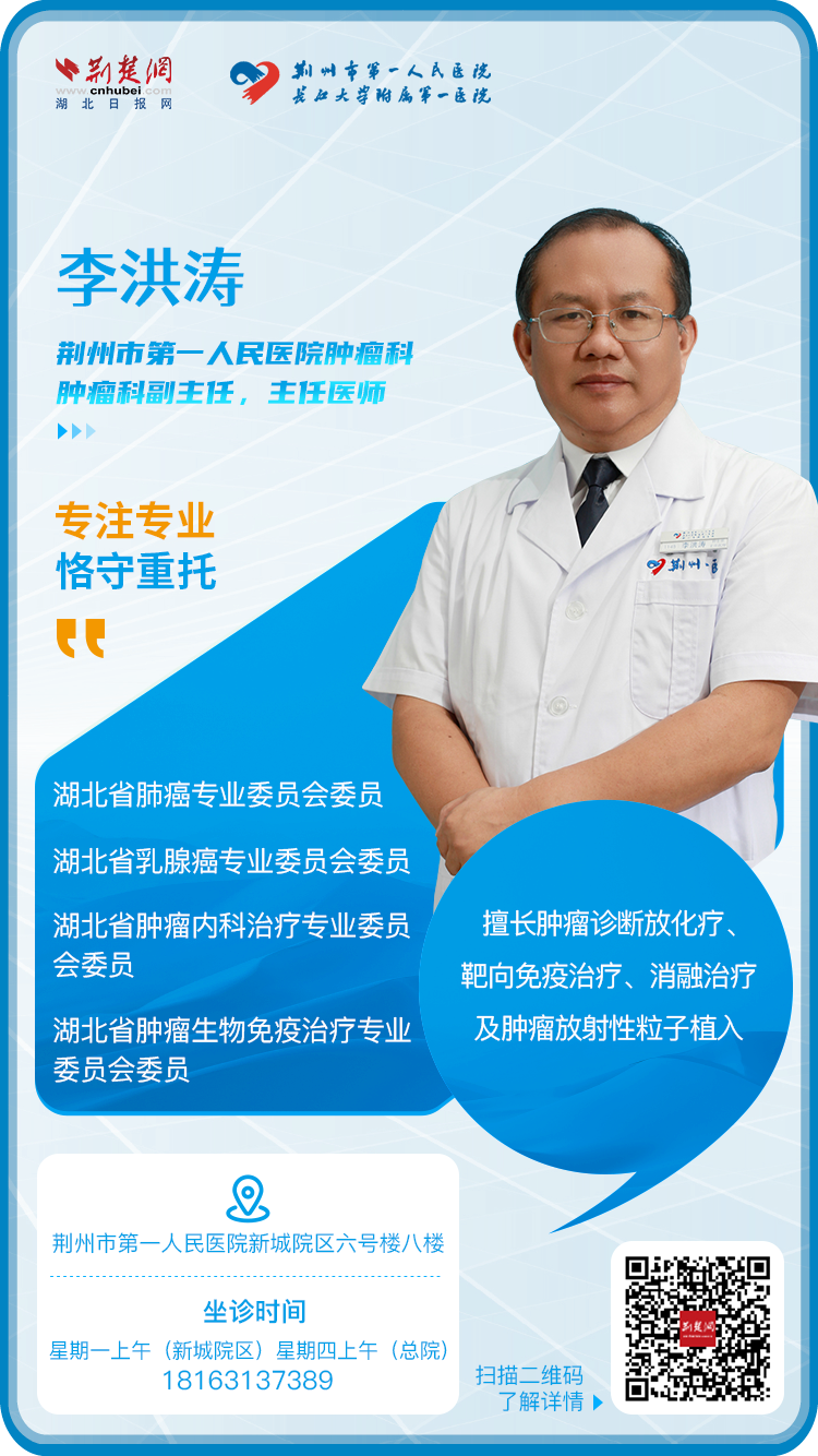 李洪涛:肿瘤科副主任、主治医师,湖北省肺癌专家委员会、湖北省乳腺癌专家委员会、湖北省肿瘤医学专家委员会、湖北省肿瘤生物免疫治疗专家委员会、湖北省软组织肿瘤专家委员会委员。