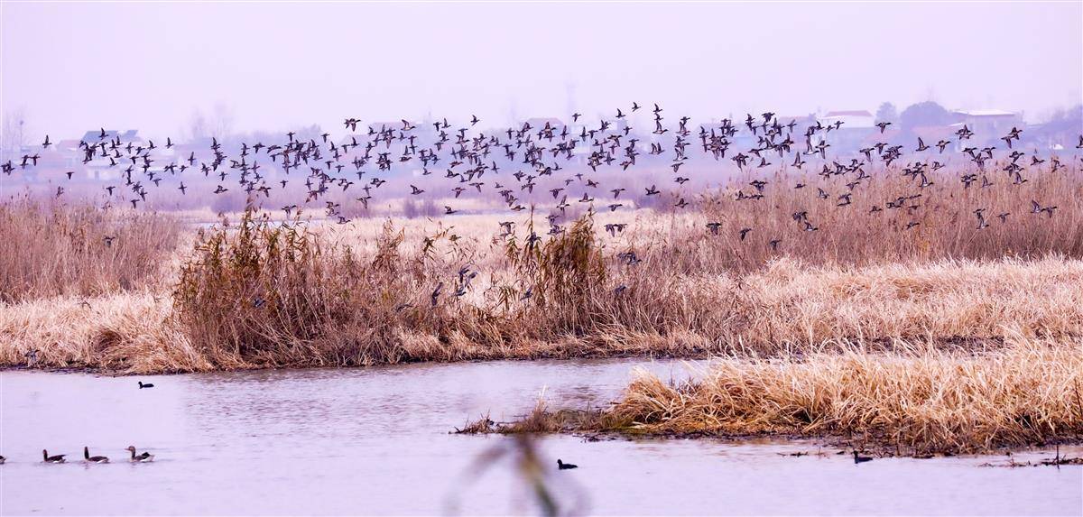数千只鸟类在罗坎湖湿地同时飞翔,扩大了生态
