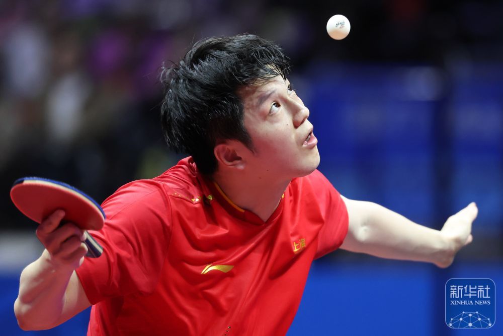 ^ 河北队球员梁靖昆在比赛中回球。他以2-3输给了上海队的樊振东。新华社记者 徐亮 供图